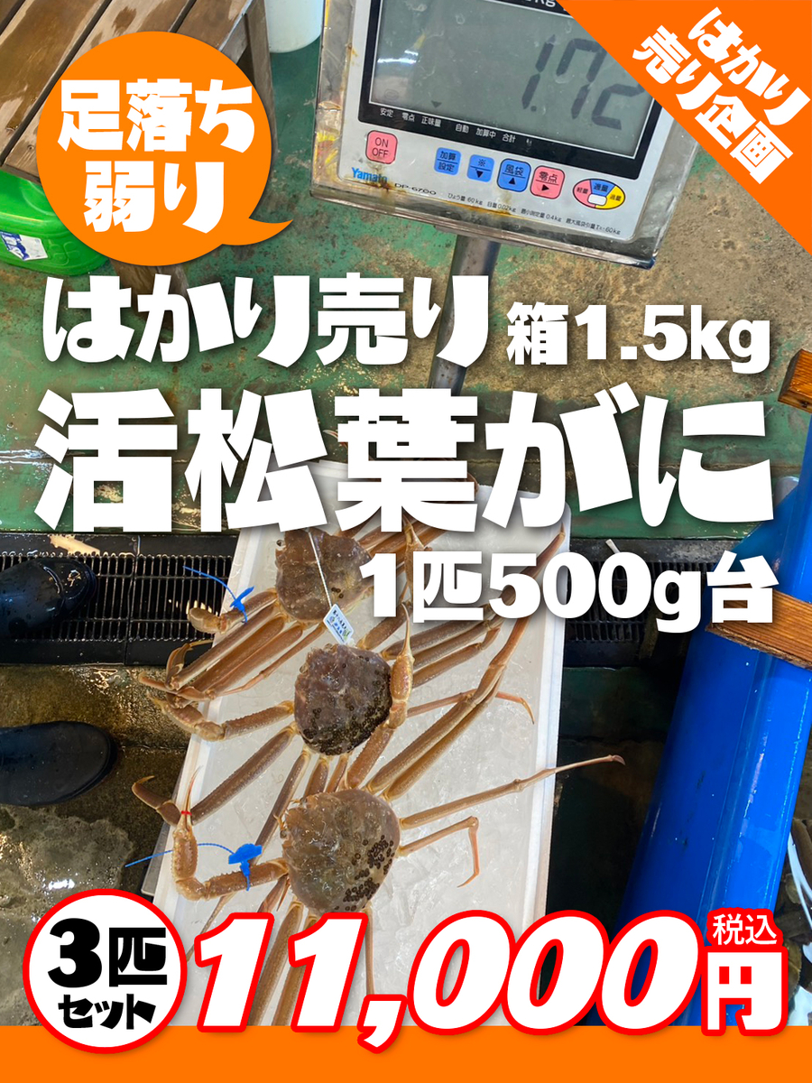 【数量限定】はかり売り!弱り活松葉がに1.5kg箱セット(500g台×3匹)【本日の掘り出し物】 ツイートする シェアする 販売価格: 11,000円(税込み) 会員価格 (税込み) 通常価格 (税込み) 在庫 4 商品コード 99-14 JANコード 数量 - + カートに入れる お気に入りリストへ追加する カテゴリー 本日の掘り出し物