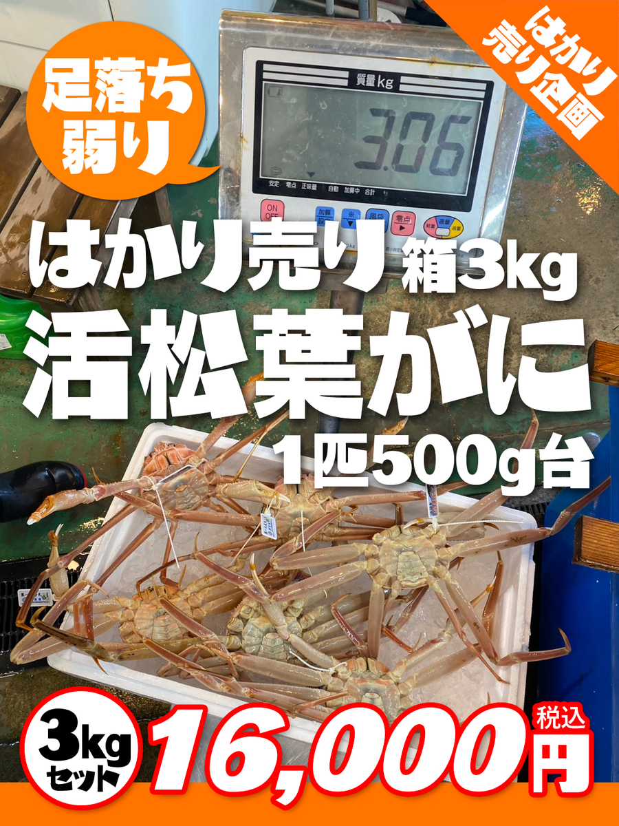 【数量限定】はかり売り!弱り活松葉がに3kg箱セット(500g台×6匹)【本日の掘り出し物】 ツイートする シェアする 販売価格: 16,000円(税込み) 会員価格 (税込み) 通常価格 (税込み) 在庫 3 商品コード 99-15 JANコード 数量 - + カートに入れる お気に入りリストへ追加する カテゴリー 本日の掘り出し物