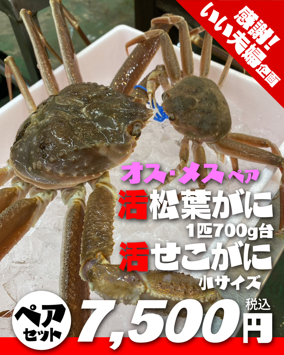【いい夫婦特集】活松葉がに700g台1匹×活せこがに小サイズ1匹ペア【本日の掘り出し物】 ツイートする シェアする 販売価格: 7,500円(税込み) 会員価格 (税込み) 通常価格 (税込み) 在庫 0 商品コード 99-17 JANコード 数量 - + 販売期間外のため注文いただけません。 お気に入りリストへ追加する カテゴリー 本日の掘り出し物 販売期間 2025/11/18 12:05~2025/11/23 00:00