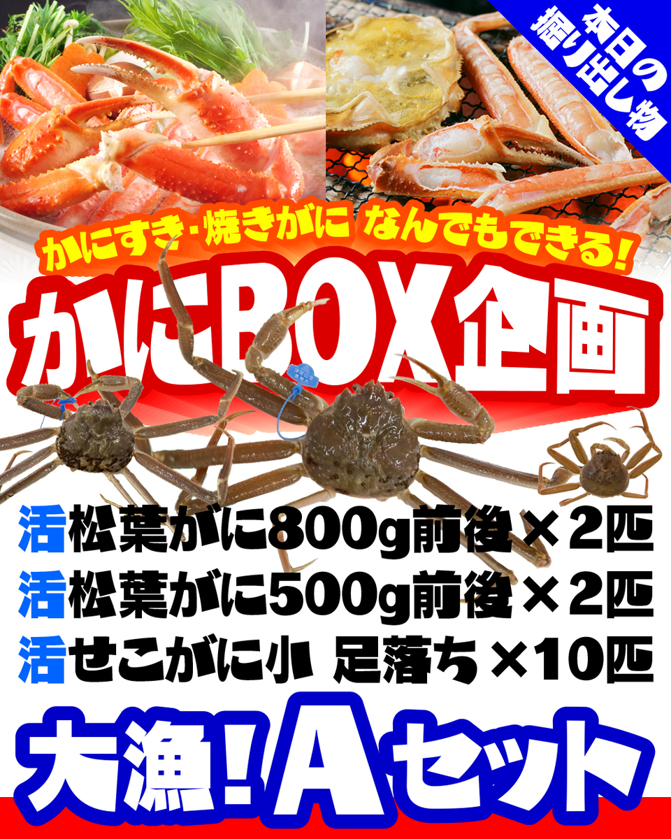 【かにBOX企画】大漁!Aセット/活松葉800g+活松葉500g+活せこ小【本日の掘り出し物】 ツイートする シェアする 販売価格: 33,000円(税込み) 会員価格 (税込み) 通常価格 (税込み) 在庫 0 商品コード 99-22 JANコード 数量 - + 販売期間外のため注文いただけません。 お気に入りリストへ追加する カテゴリー 本日の掘り出し物 販売期間 2025/11/18 12:05~2025/11/23 00:00