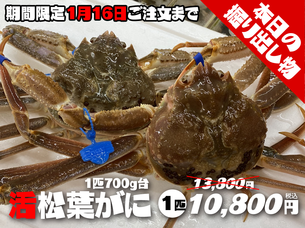 【成人の日企画】活松葉がに700g台超お得1匹【本日の掘り出し物】 ツイートする シェアする 販売価格: 10,800円(税込み) 会員価格 (税込み) 通常価格 (税込み) 在庫 20 商品コード 99-25 JANコード 数量 - + カートに入れる お気に入りリストへ追加する カテゴリー 本日の掘り出し物 販売期間 2026/01/10~2026/01/16